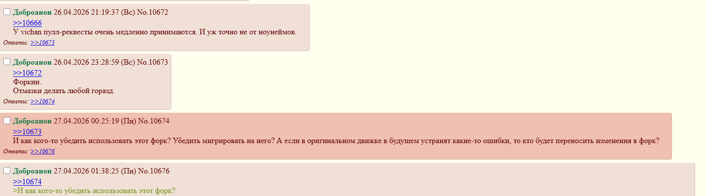Чушь везде, где в /б/ратстве не должно быть форумного культурного поведения, где на хаос(кроме прям вообще цп) могут закрыть глаза. Где админы не должны читать каждый пост и следить за порядком. (даже если аноны этого хотят) Они завлекают людей культурно общаться в скрытые разделы типа /rf, вместо общения прямо в /b по форумным культурным правилам. И говорят что это традиция и так было всегда. Хотя это очевидная бесмысленная ложь. Попутно сама же администрация в /b занимается травлями в промышленных масштабах, и уйдя в этом направлении они уже понимают что никогда не станут другими и не очистятся. Поэтому они прокляты быть плохими и цепляться хоть за что-то. Но обычный аноним, который с этого ничего не имеет, не должен шагать вместе с ними в ад. Я не знаю, может это какой-то государственный проект с высшей целью а не сумашествие администрации, чтобы на бордах оставались плохие и скоррапченные (а остальные "шли на пикабу и реддит"). Мне без разницы, меня то никто не вербовал и ни в чем не обвинял чтобы мне нужно было как-то перевоспитываться, я застал нормальный доброчан с форумными правилами и поддержу любую новую борду подобного формата. Но думать о причинах искусственно-недружелюбного местного сообщества - пустая трата времени.