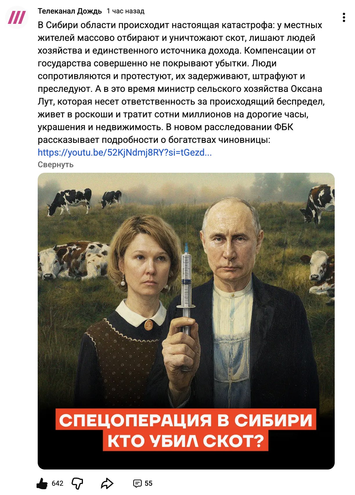 По всей России власти массово уничтожают домашний скот. Тысячами. Это абсолютно дикая история, а стоит за этим, например, такой чиновник как министр сельского хозяйства - Оксана Лут.