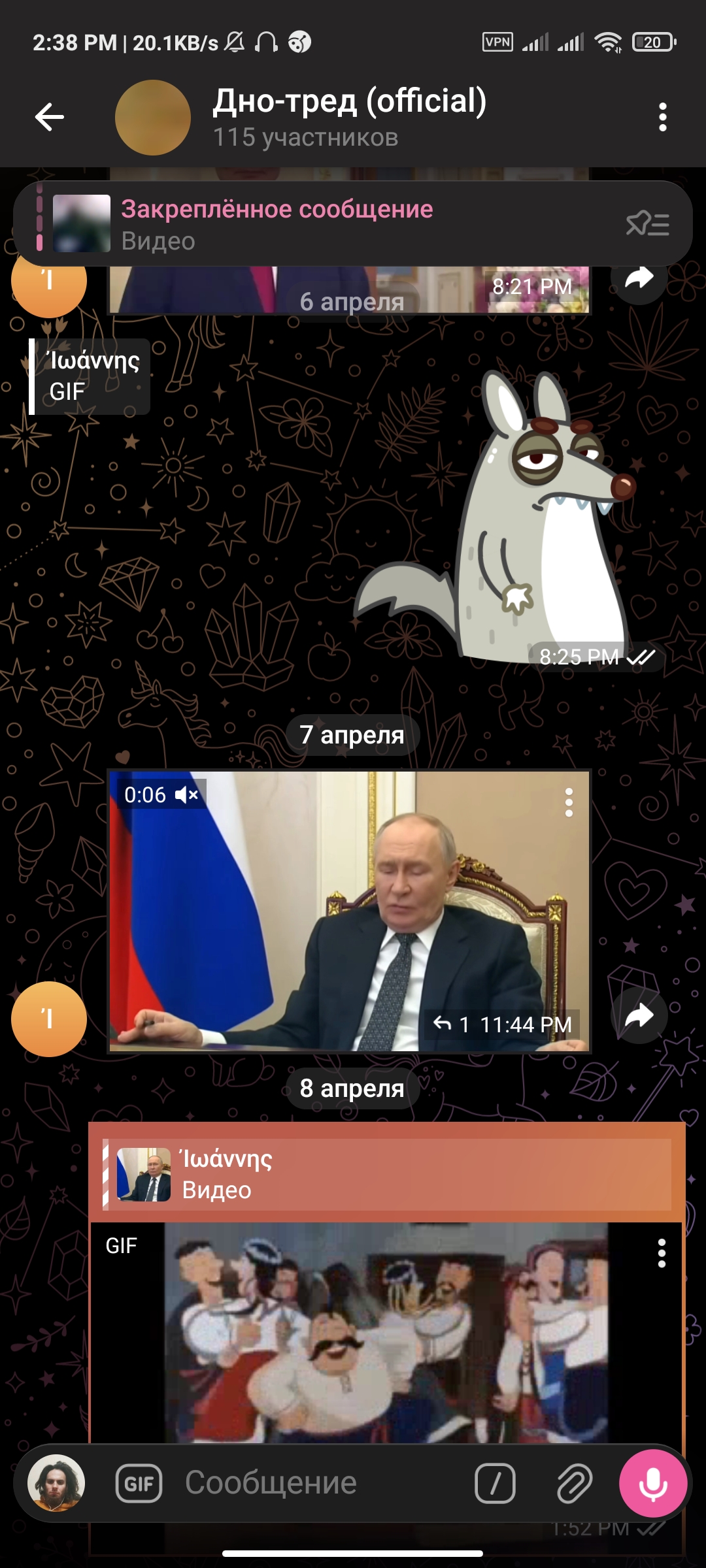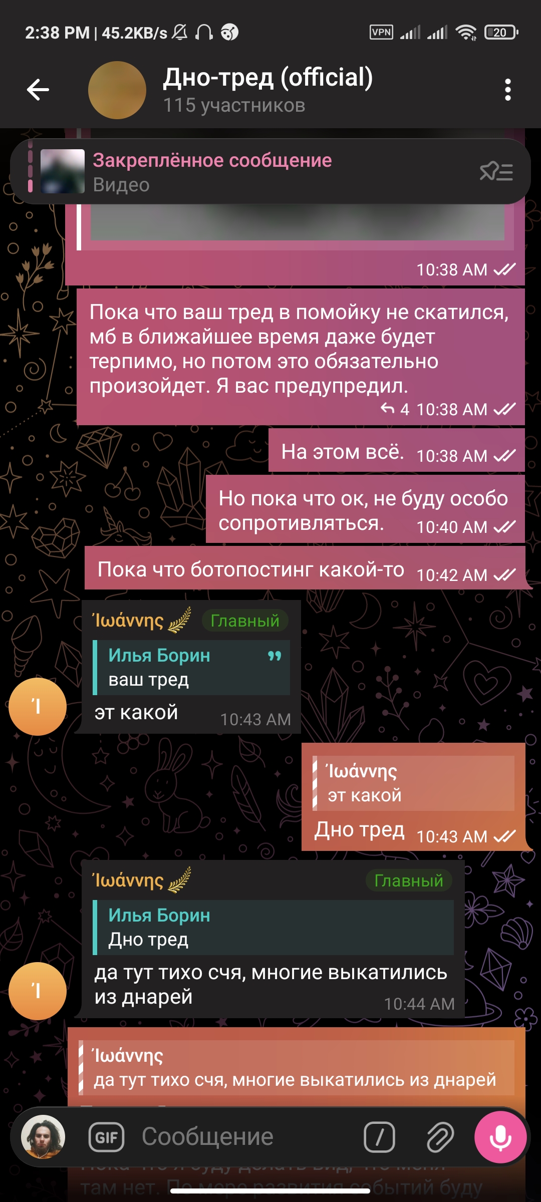 2:44 После записи голосовухи чекнул пиздос-тред и начал читать о том, в каких случаях госпитализация может быть не добровольная. Чипхолдеры сделали сильное желание отрезать себе член, затем быстро прекратили. Типы в пиздос-треде троллят, но я принял решение свалить с борды после акта беспредела модеров в мою сторону, поэтому постить туда больше не буду.